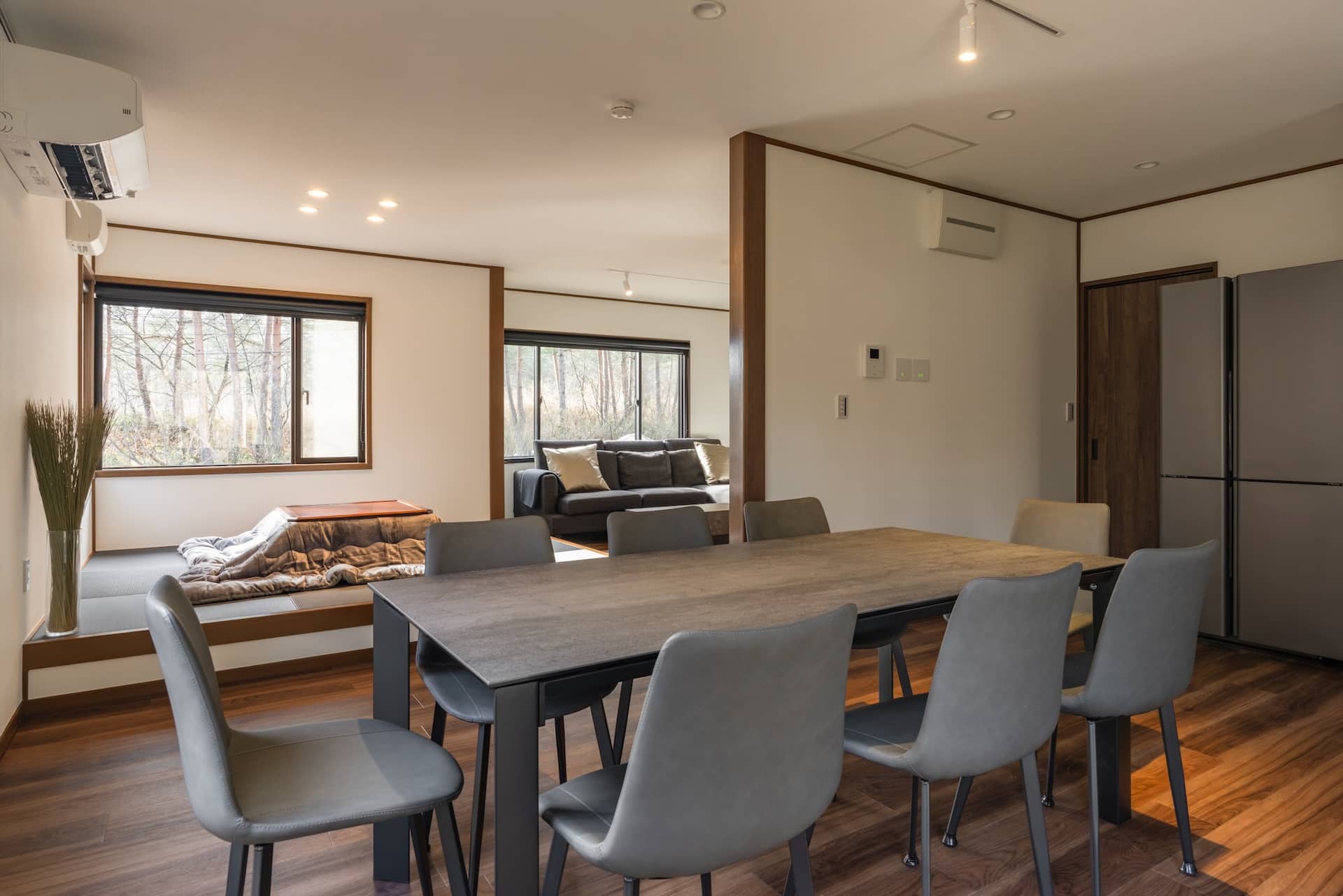 この物件は新しく改装されており、室内は清潔感が高く、統一感のある落ち着いた空間に仕上がっています。リビングスペースも広く確保されているため、食事や団らんの時間を全員で共有しやすい構造です。白馬の一棟貸しの中でも「広さ」と「快適性」を両立しているタイプといえます。